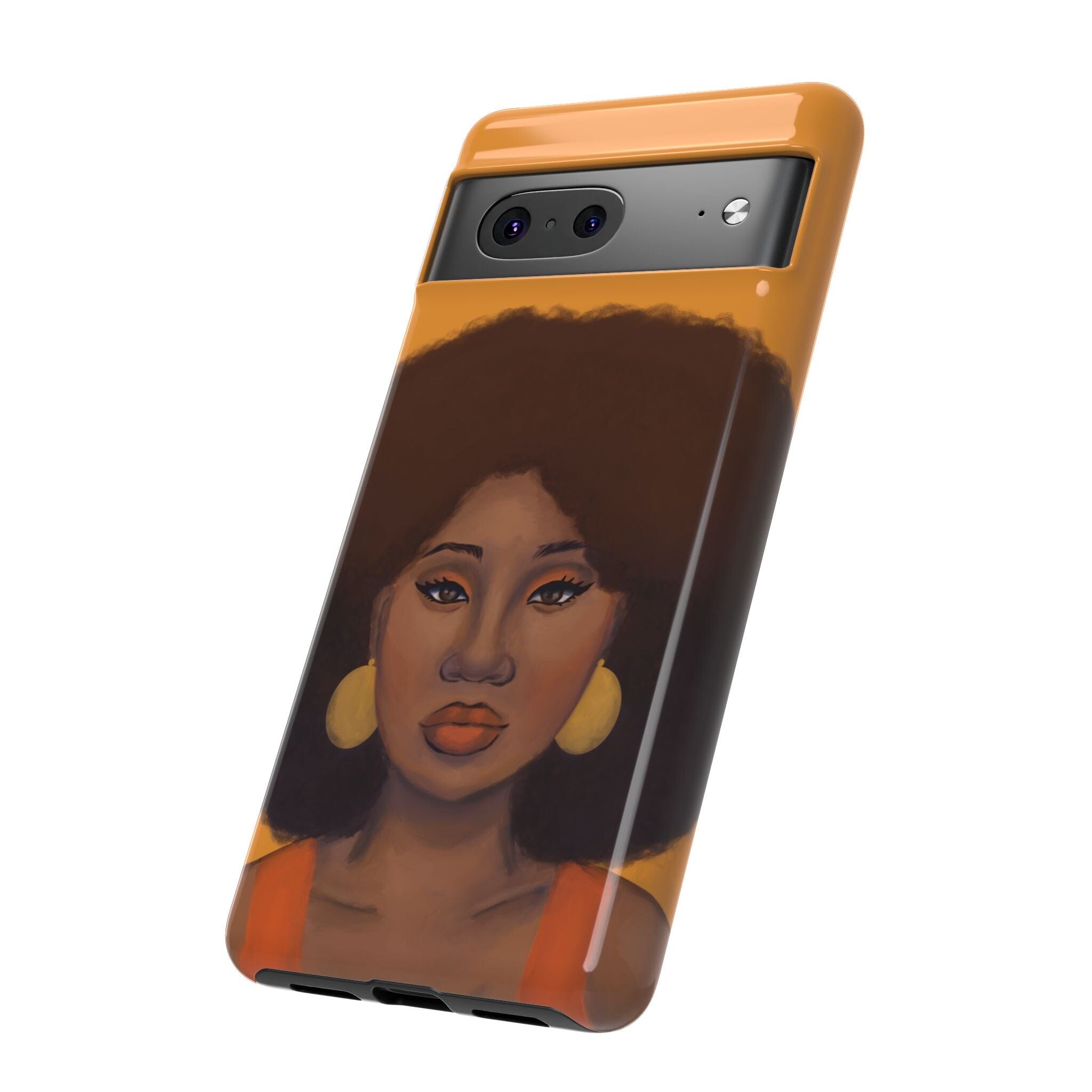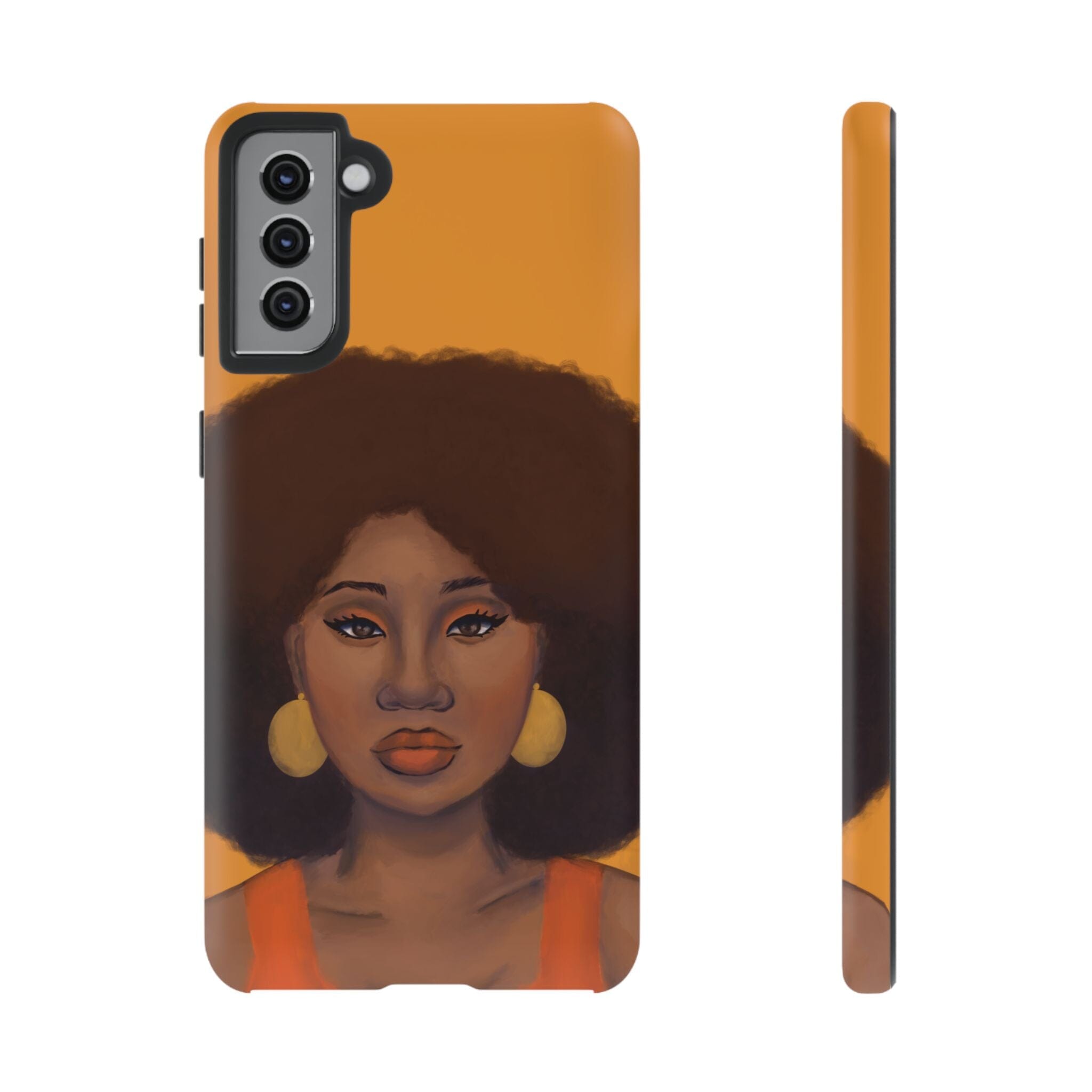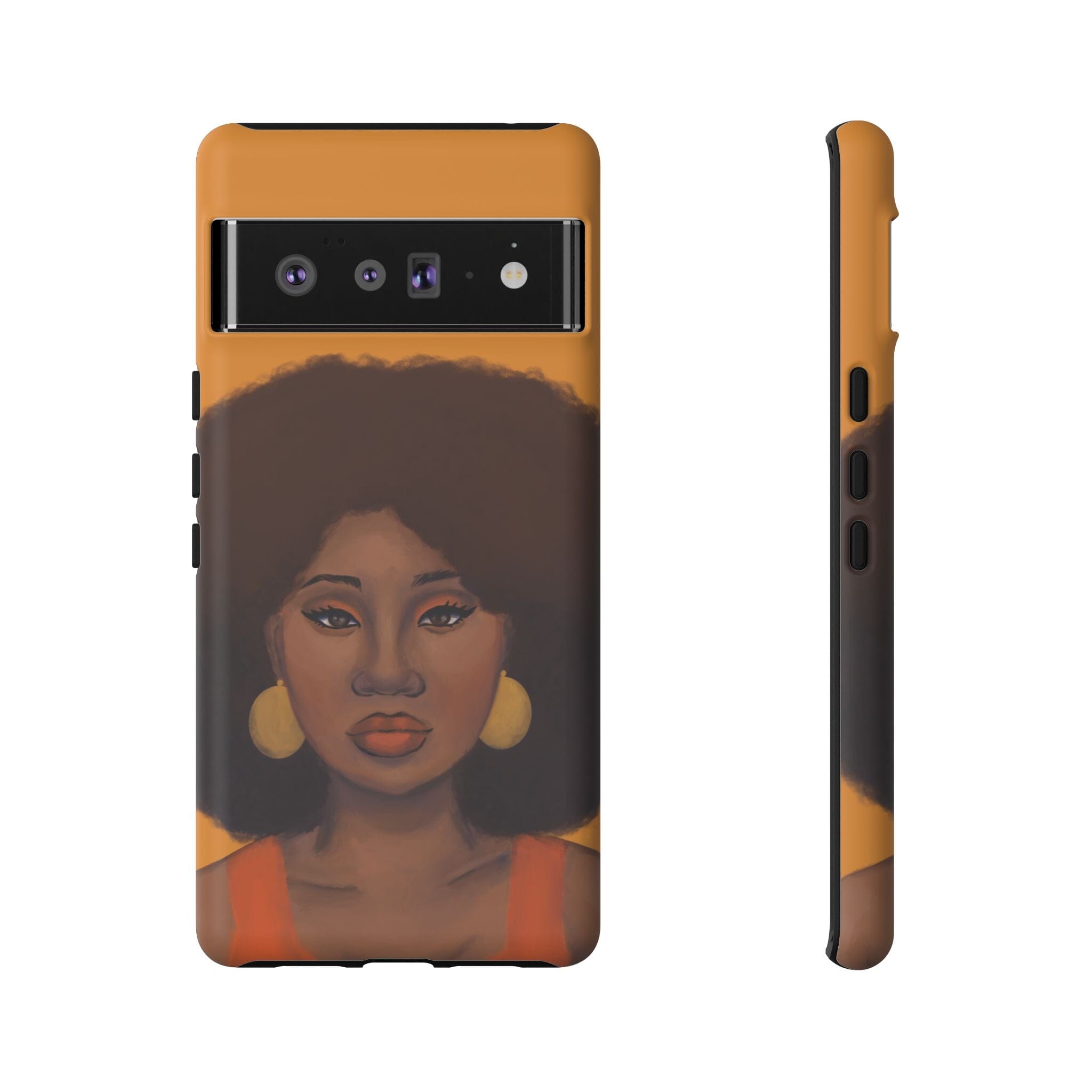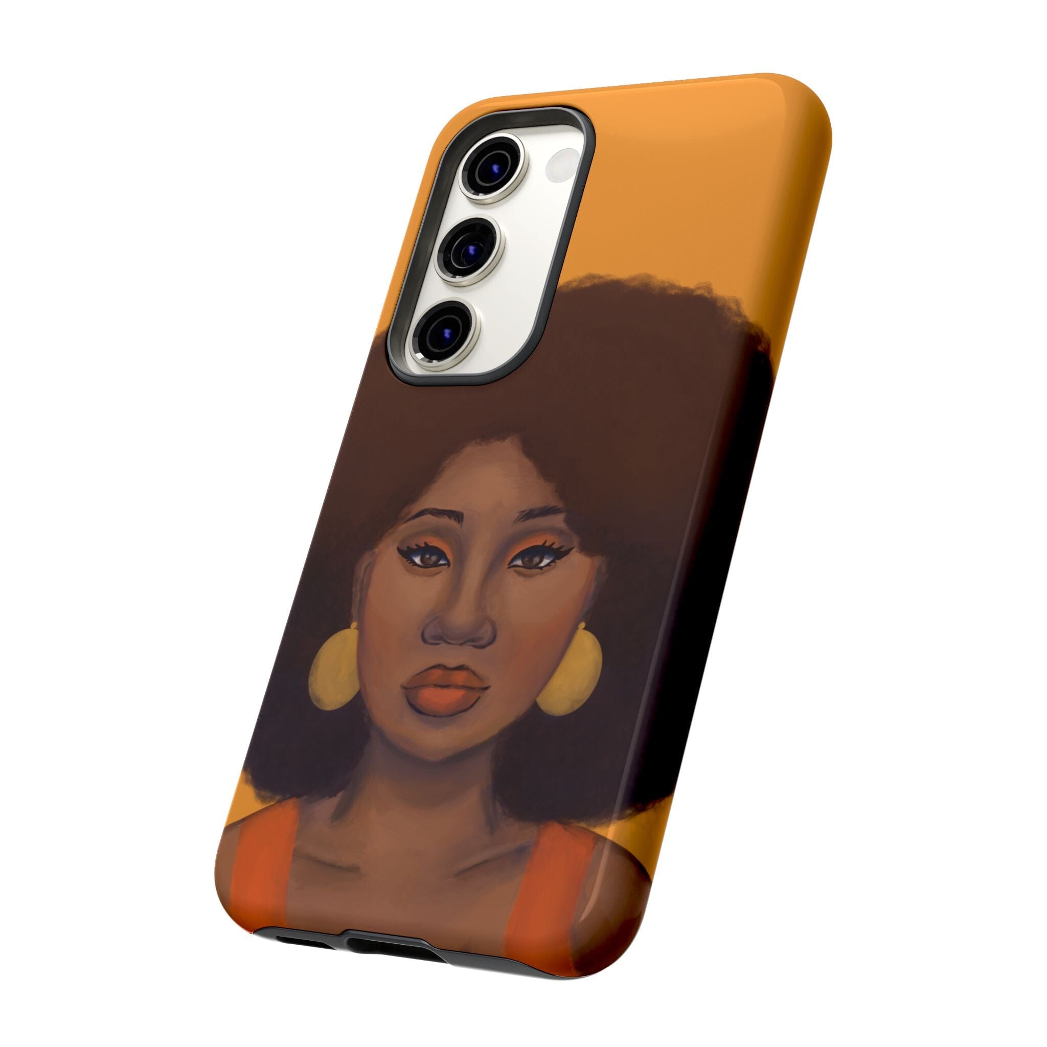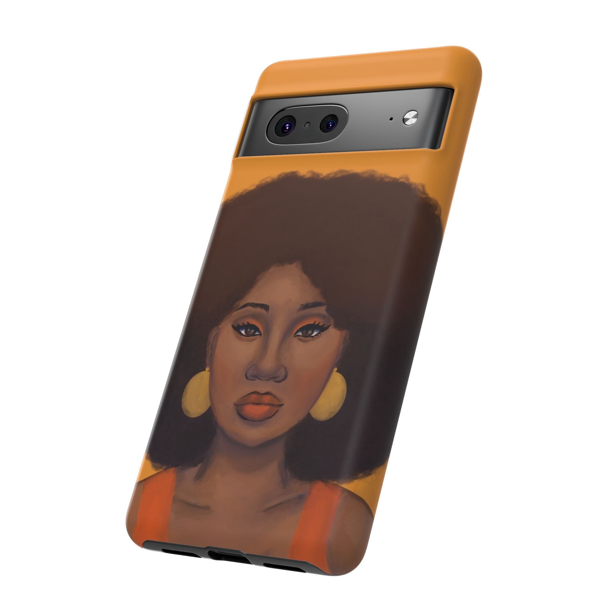 A premium tough phone case featuring a colorful illustration of a Black woman with an afro. These phone cases are made with impact-resistant polycarbonate outer shell and feature an inner TPU liner for extra protection against accidental drops.