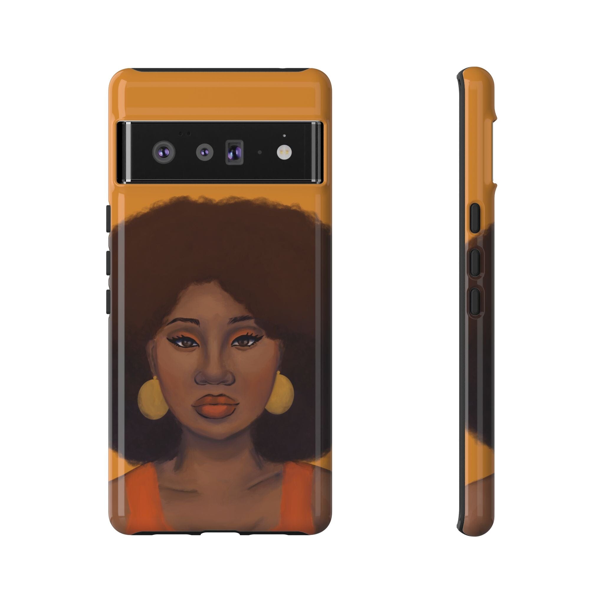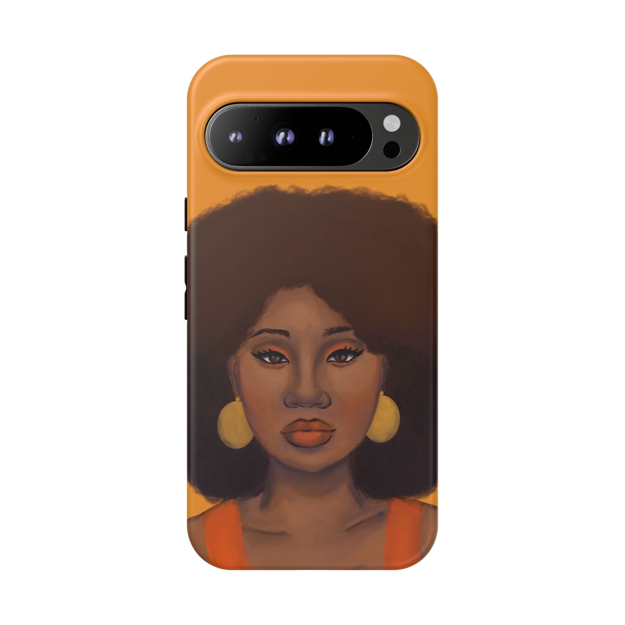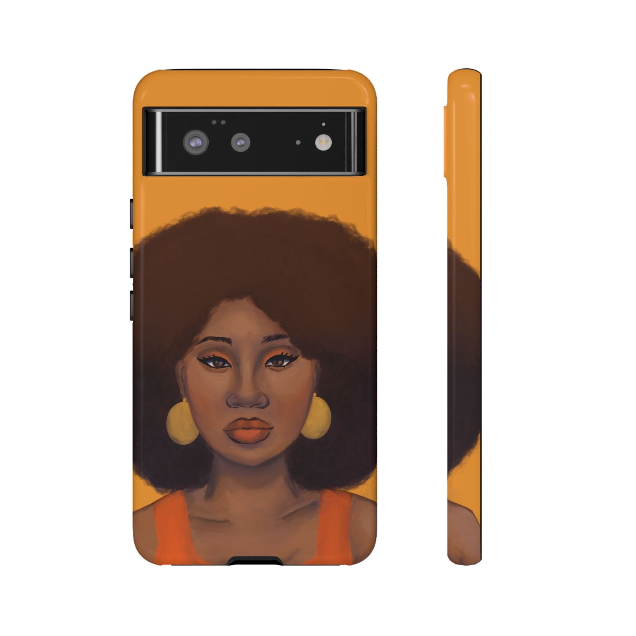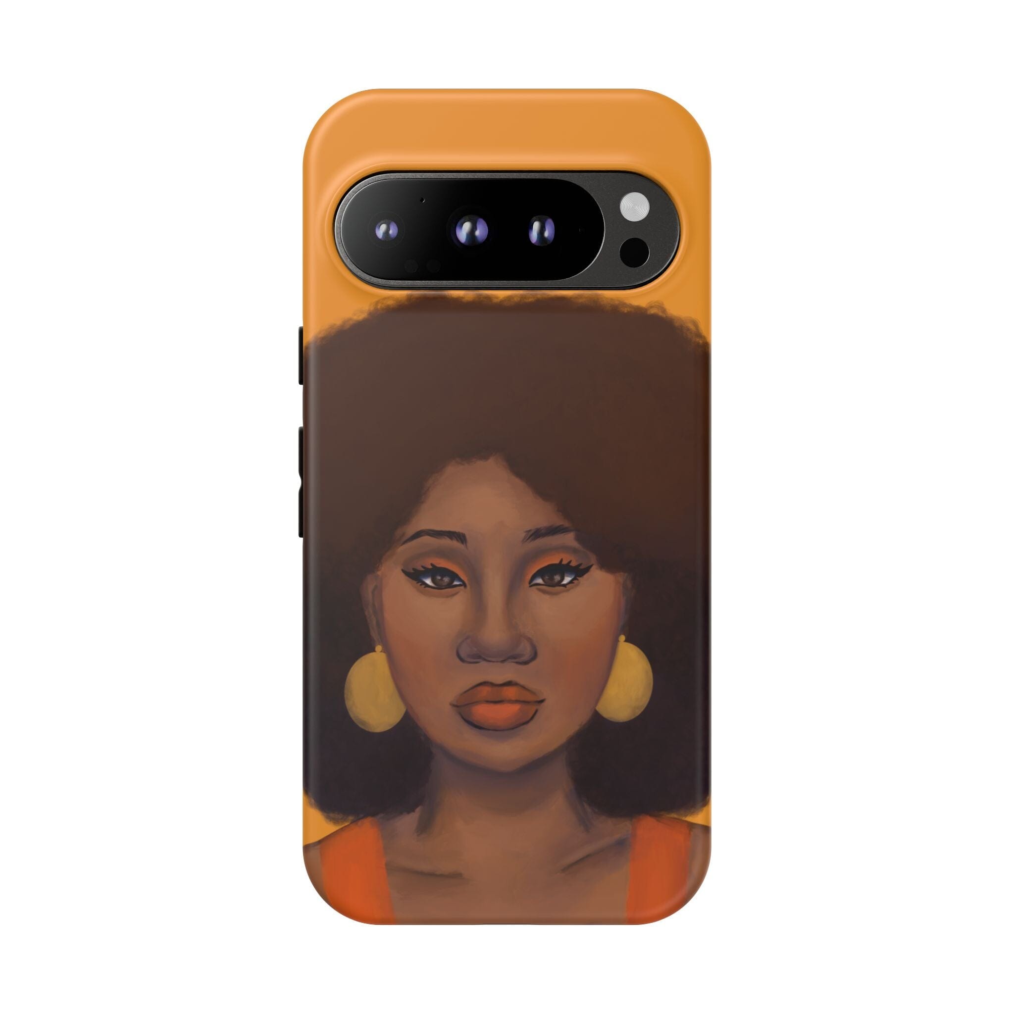 A premium tough phone case featuring a colorful illustration of a Black woman with an afro. These phone cases are made with impact-resistant polycarbonate outer shell and feature an inner TPU liner for extra protection against accidental drops.