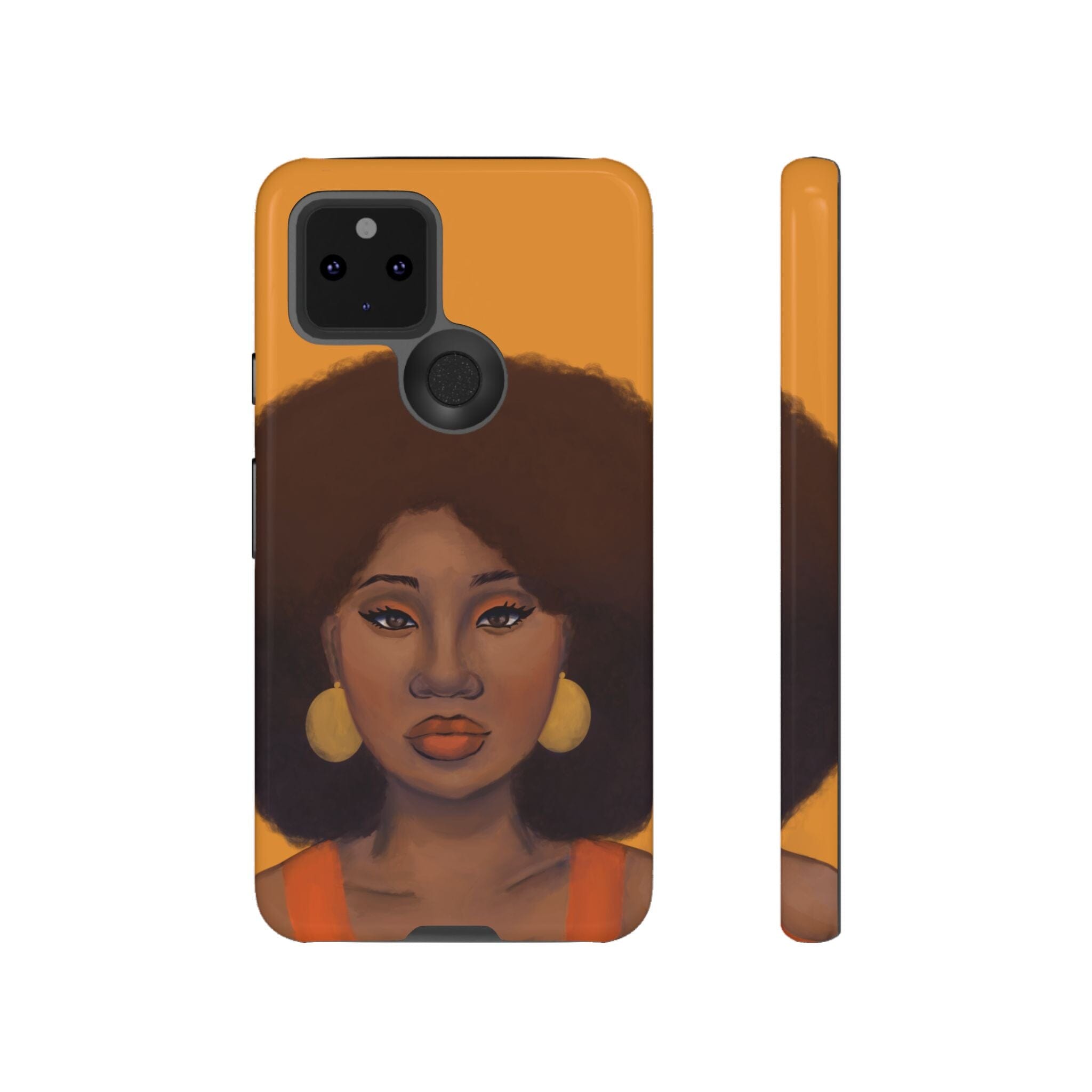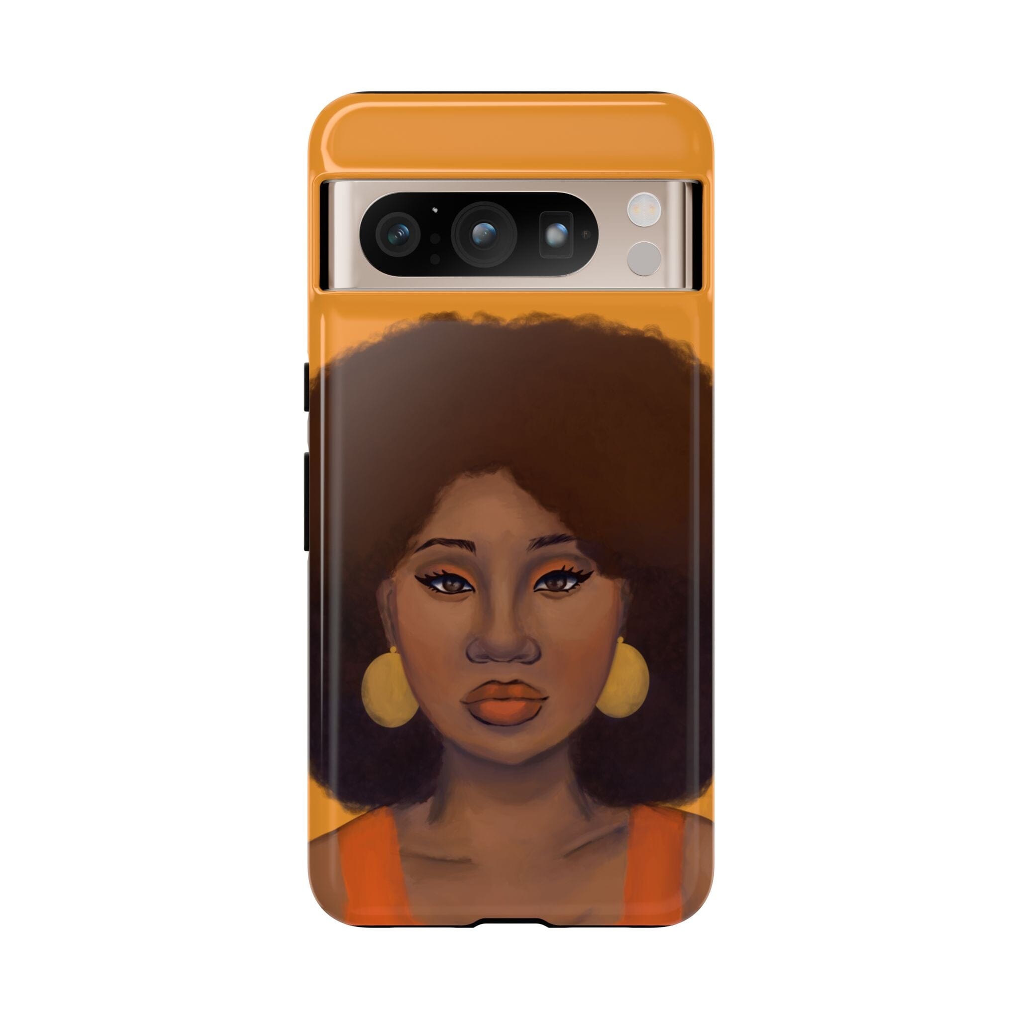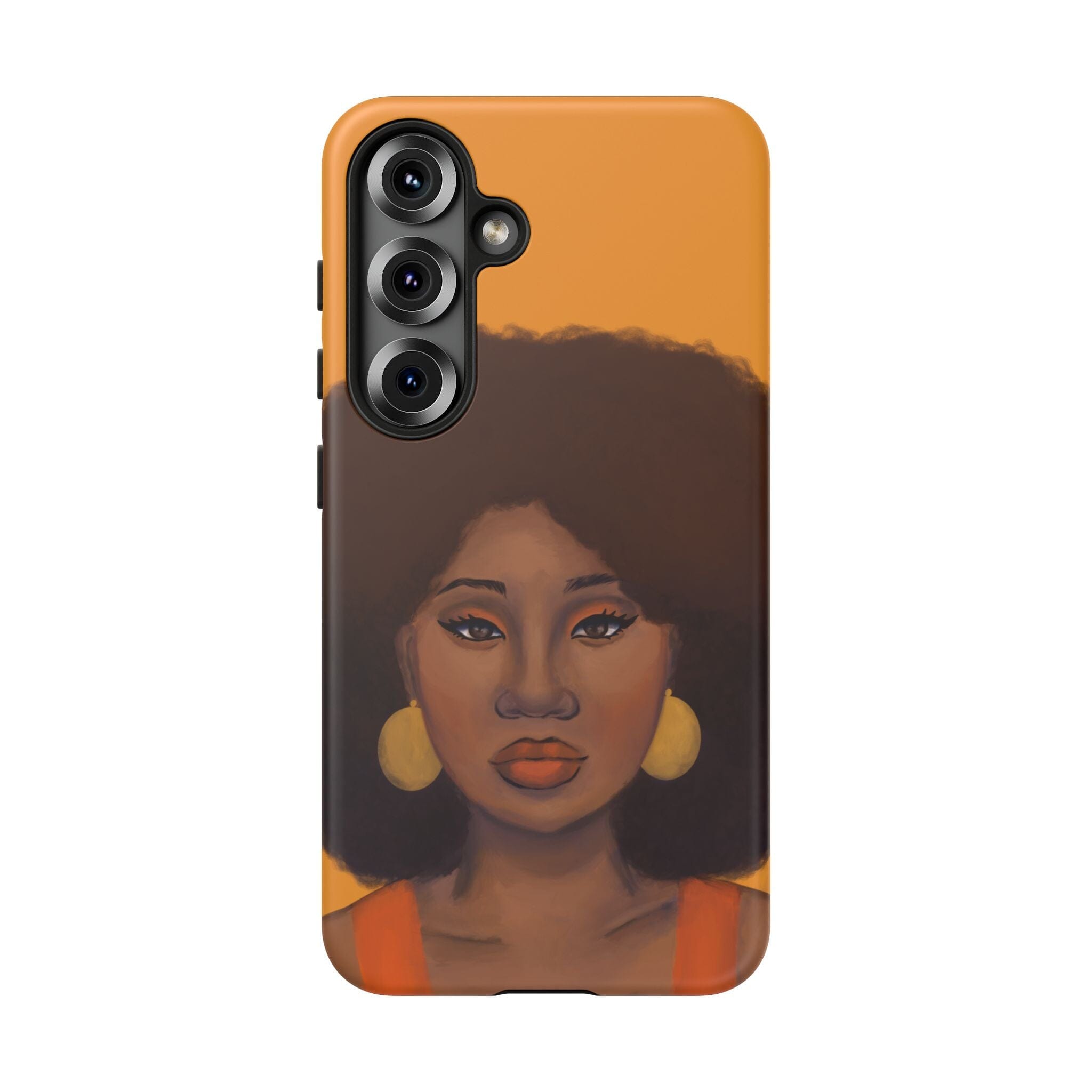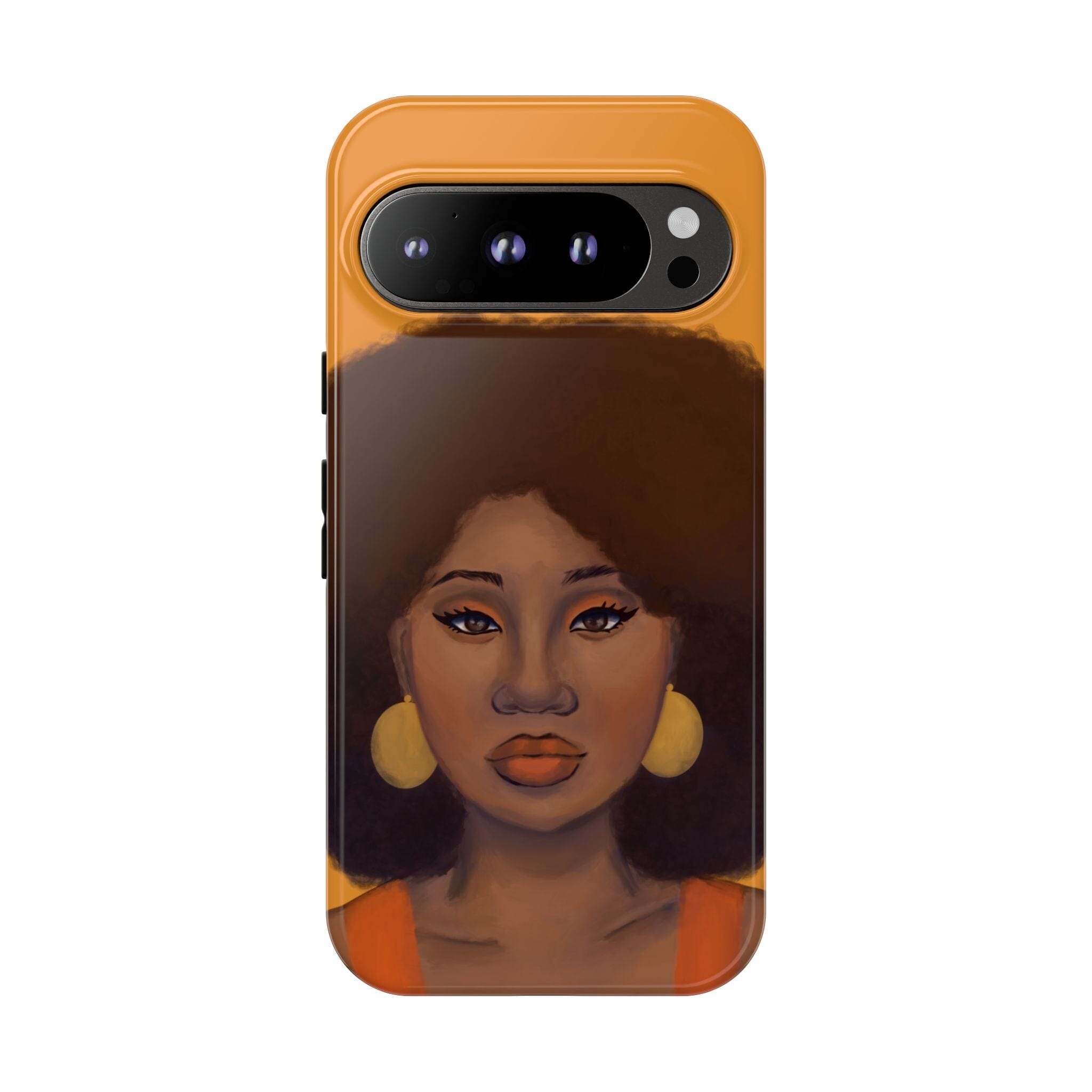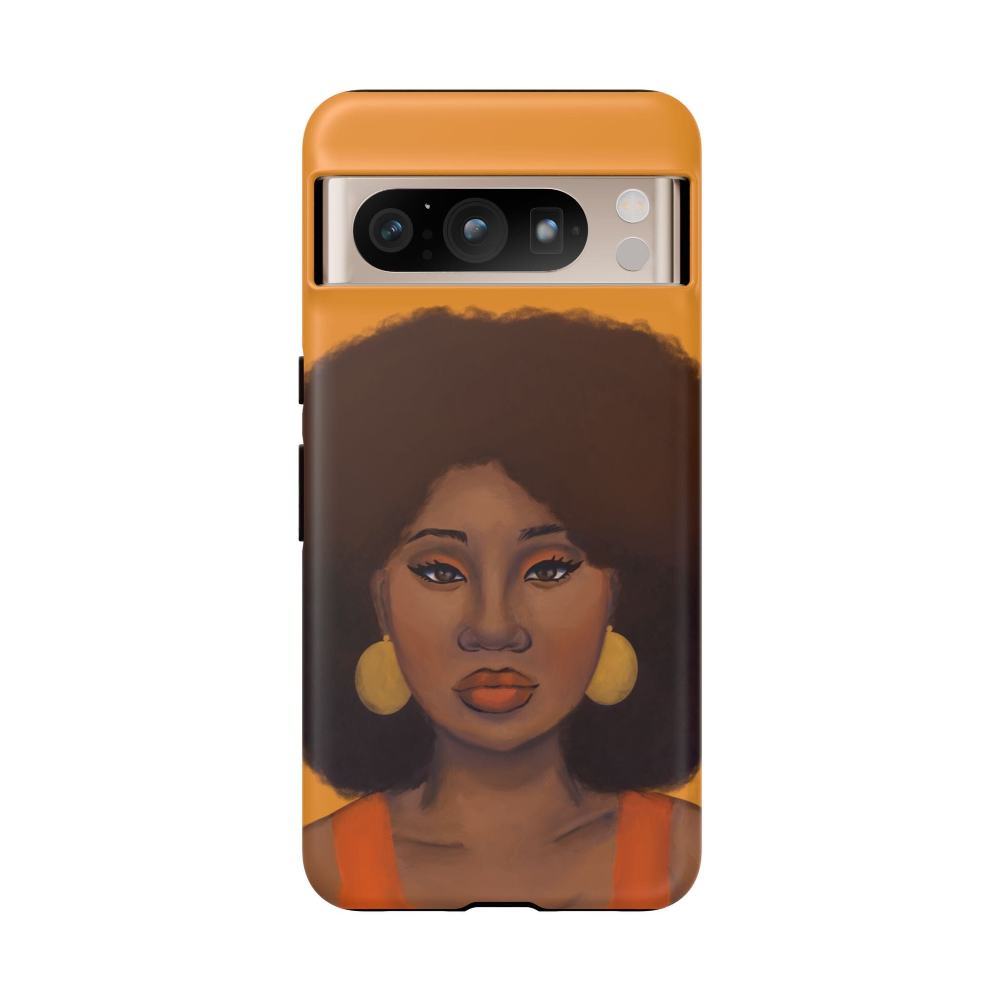 A premium tough phone case featuring a colorful illustration of a Black woman with an afro. These phone cases are made with impact-resistant polycarbonate outer shell and feature an inner TPU liner for extra protection against accidental drops.