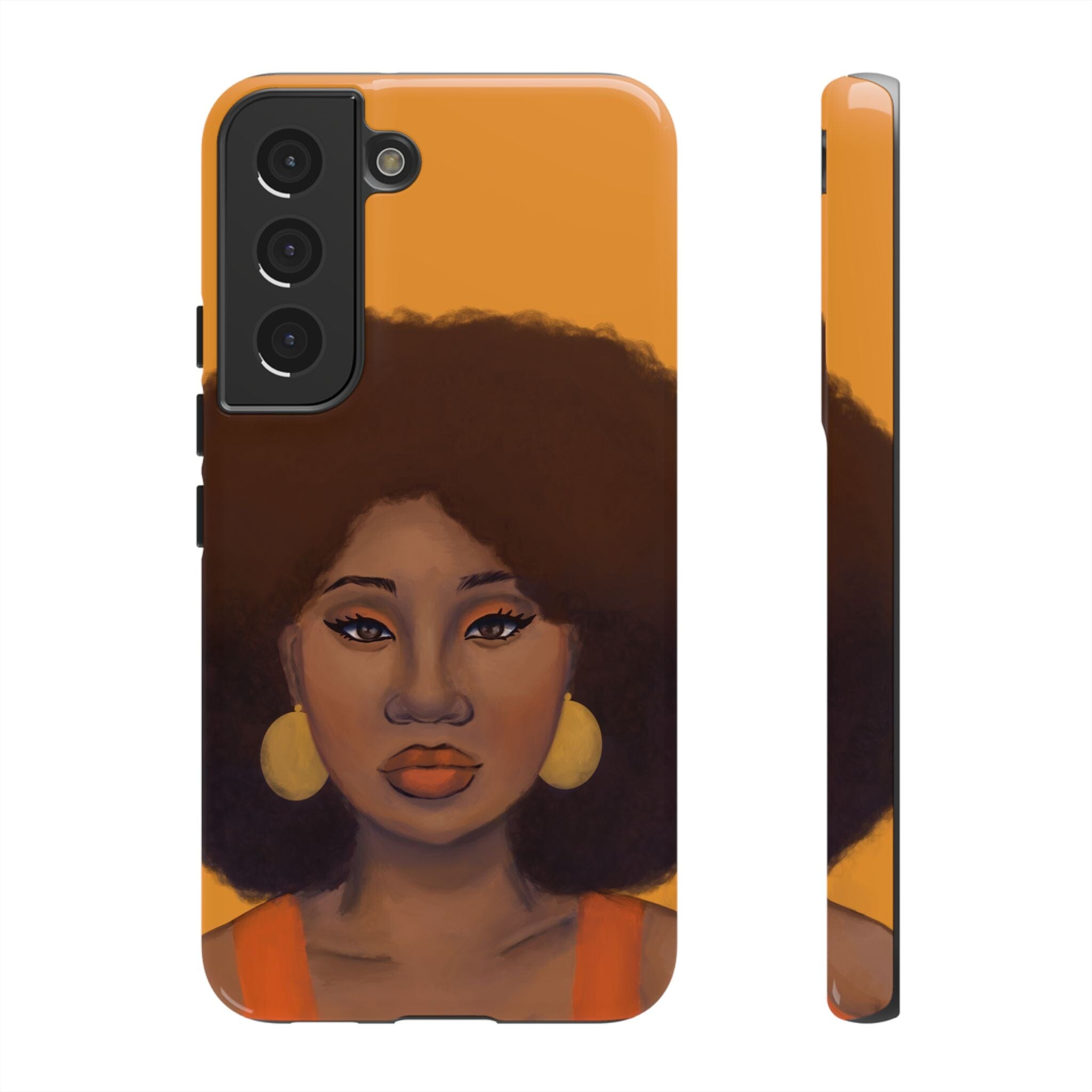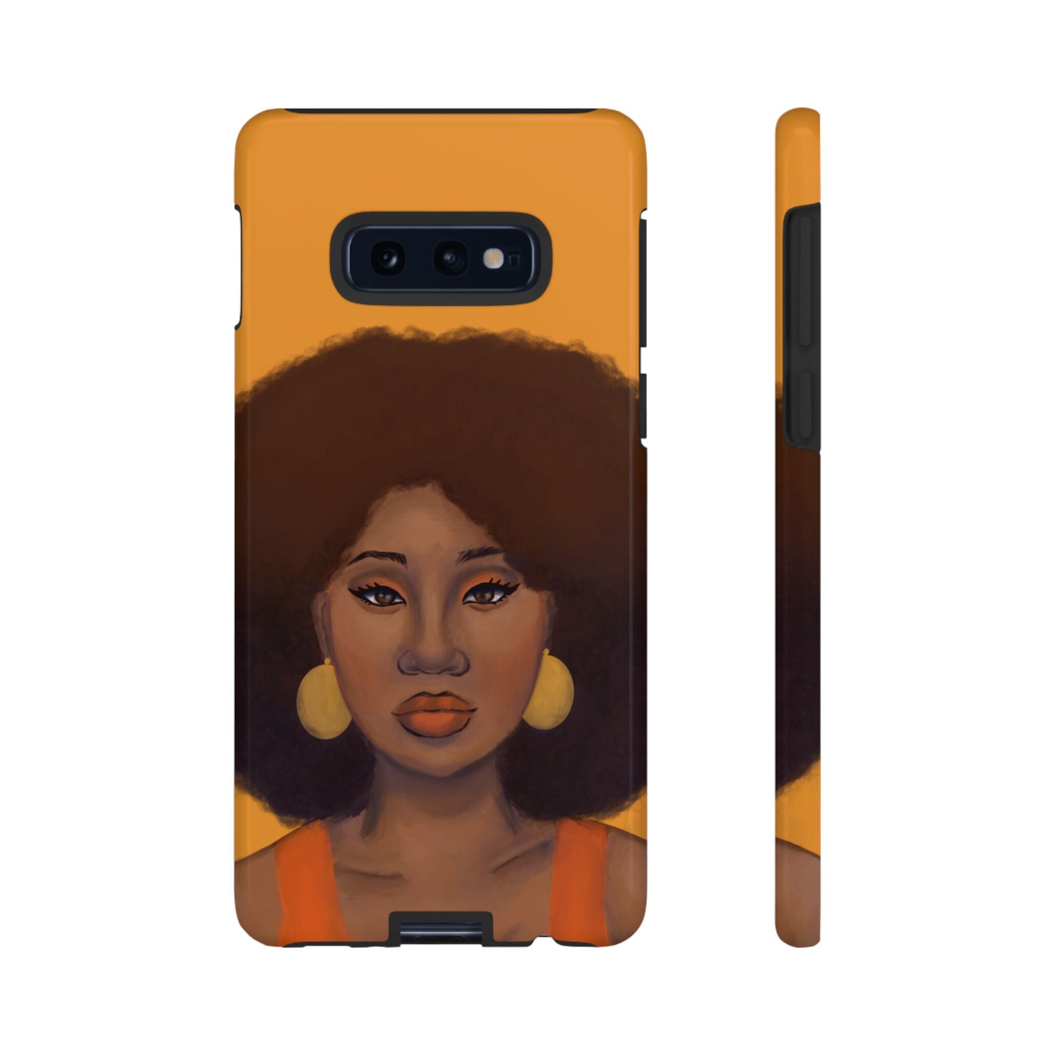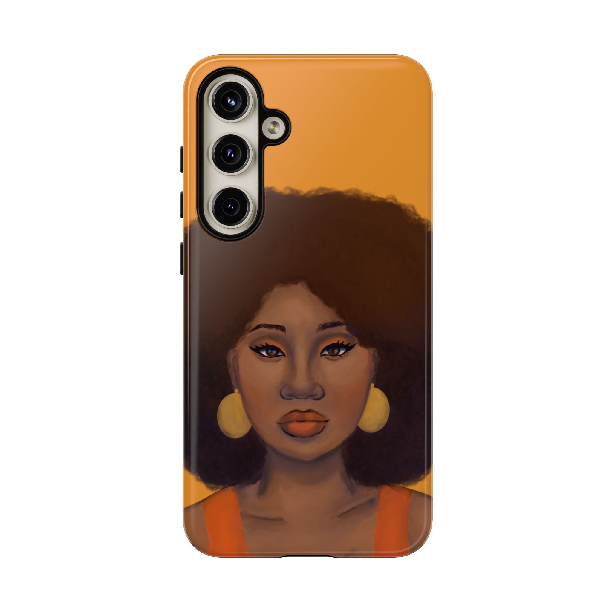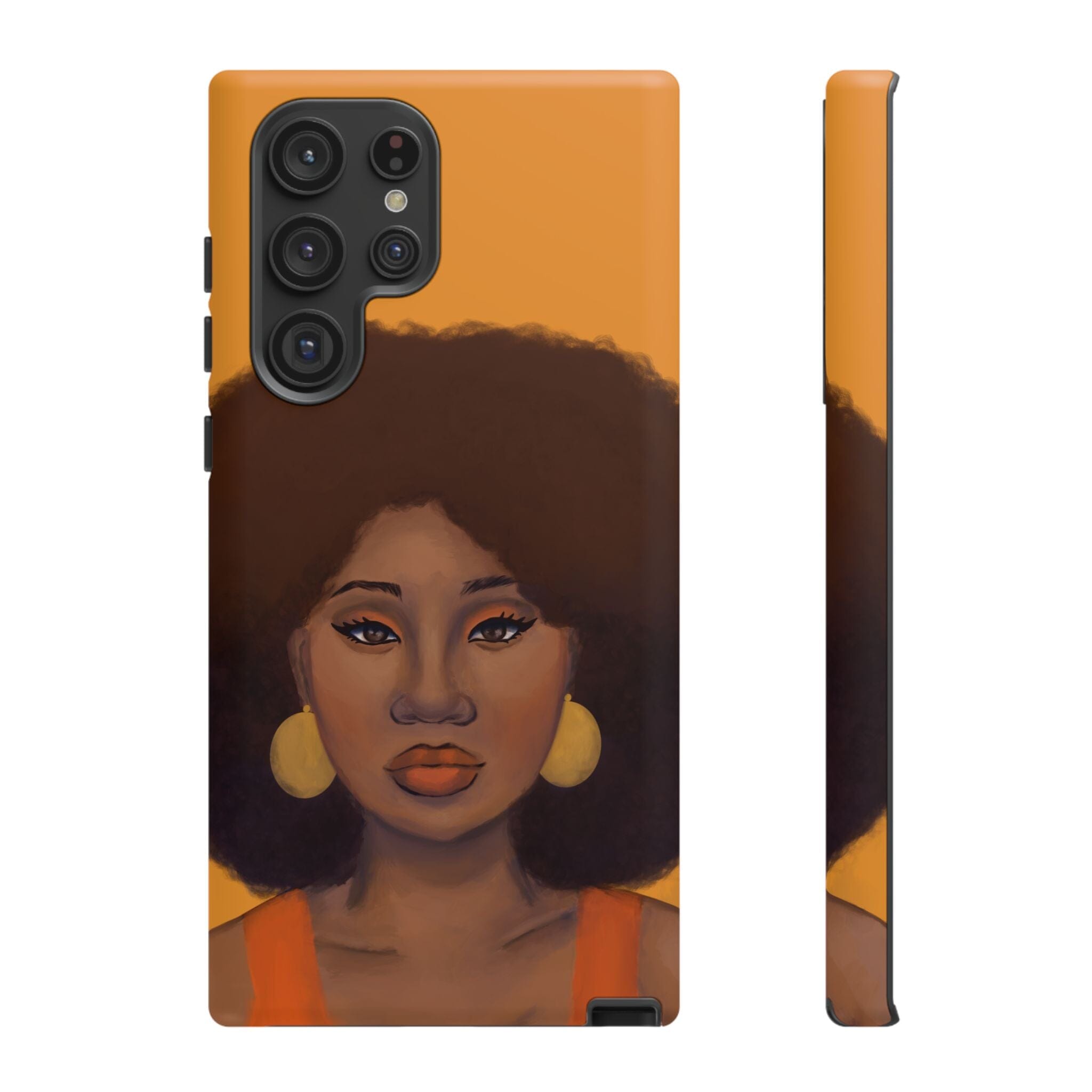 A premium tough phone case featuring a colorful illustration of a Black woman with an afro. These phone cases are made with impact-resistant polycarbonate outer shell and feature an inner TPU liner for extra protection against accidental drops.