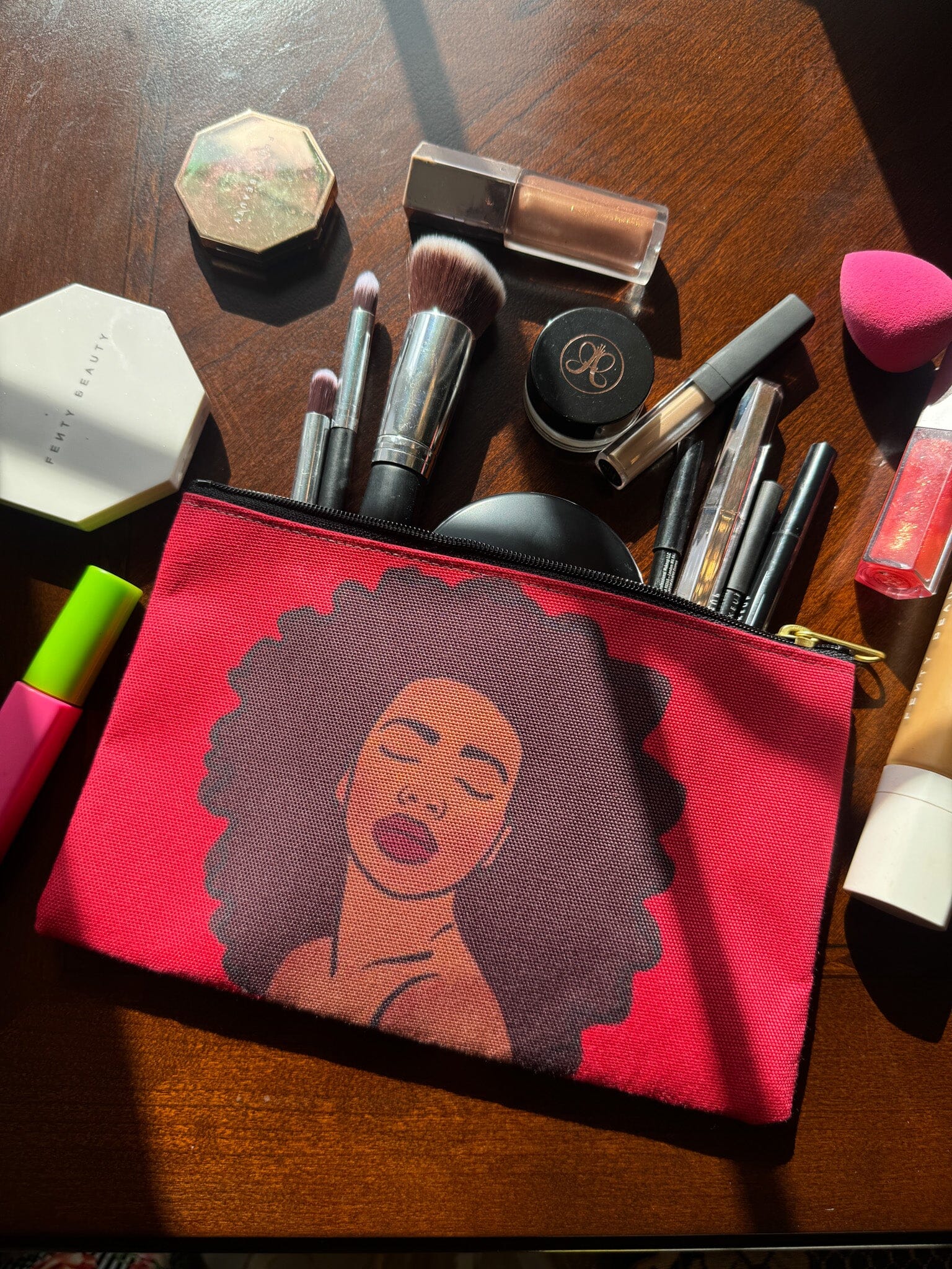 This red afro woman pouch is perfect for organizing makeup, toiletries, pencils or small accessories. Small size fits everyday makeup, edge control brush pencils, pens, and essentials. Large size fits large hair brushes, wide tooth combs, and full size products. Perfect for gifting on Mother's Day, birthdays, back to school or as a thoughtful gesture.